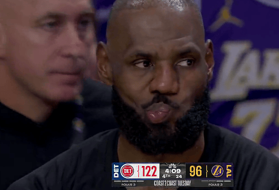 第四節比賽中,人分鄧羅打成3+1領先湖人26分,東契東契奇下場、奇下詹姆斯表情嚴肅。嚴肅