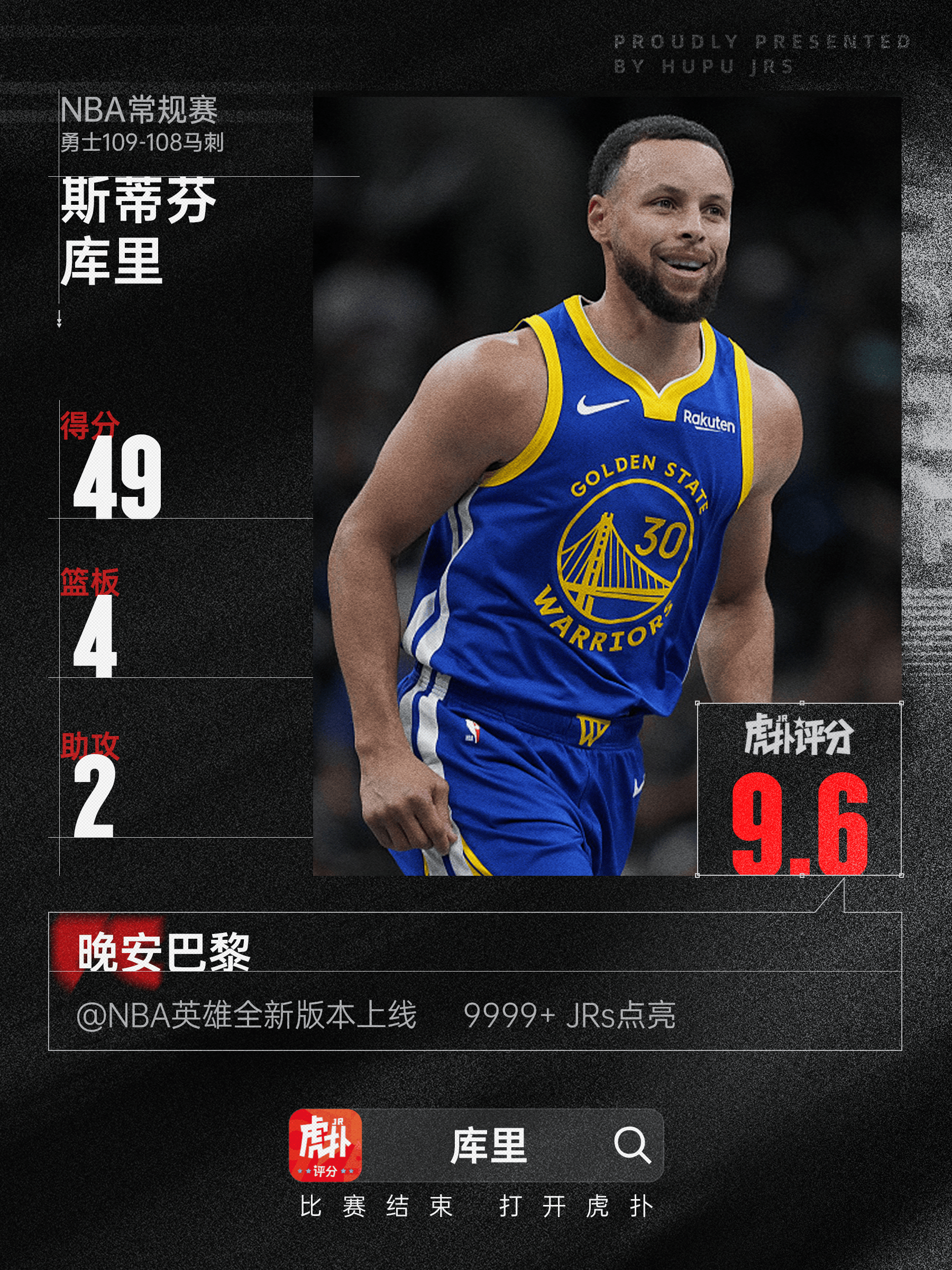 本場比賽,攻搶勇士球員斯蒂芬-庫里出戰36分鐘,26投16中,其中三分球17投9中,罰球8投8中,得到49分4籃板2助攻2搶斷。