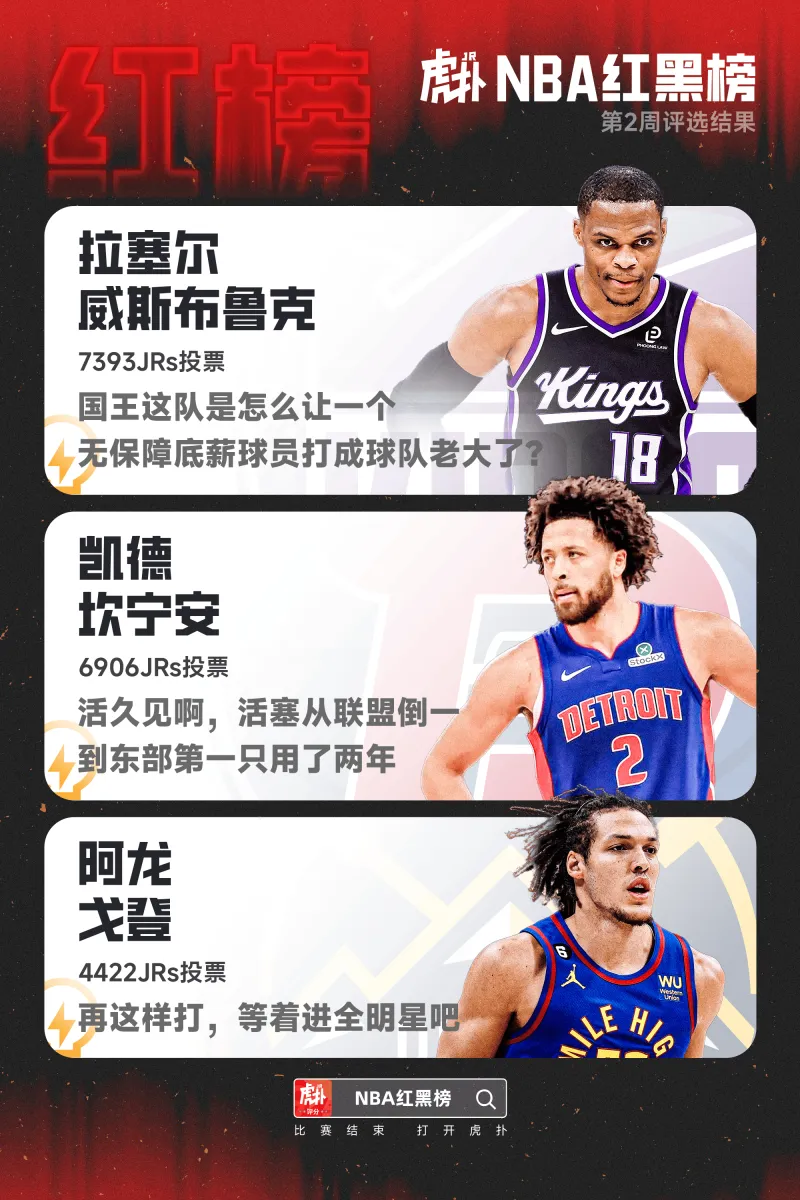 第二周的NBA常規賽結束后,我們的結果紅黑榜評選活動繼續開啟,邀請JRs依據上周球員和教練們的威少表現,理性客觀的坎寧評選出三位紅榜人選、三位黑榜人選。第周登頂