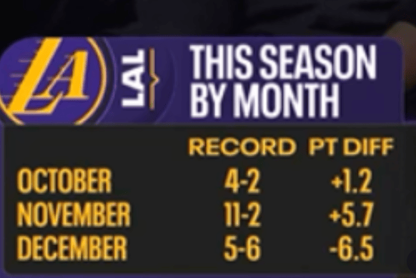 轉播方曬出數據,戰績湖人本賽季各個月份(當地時間)的月勝月勝戰績和凈勝分如下: