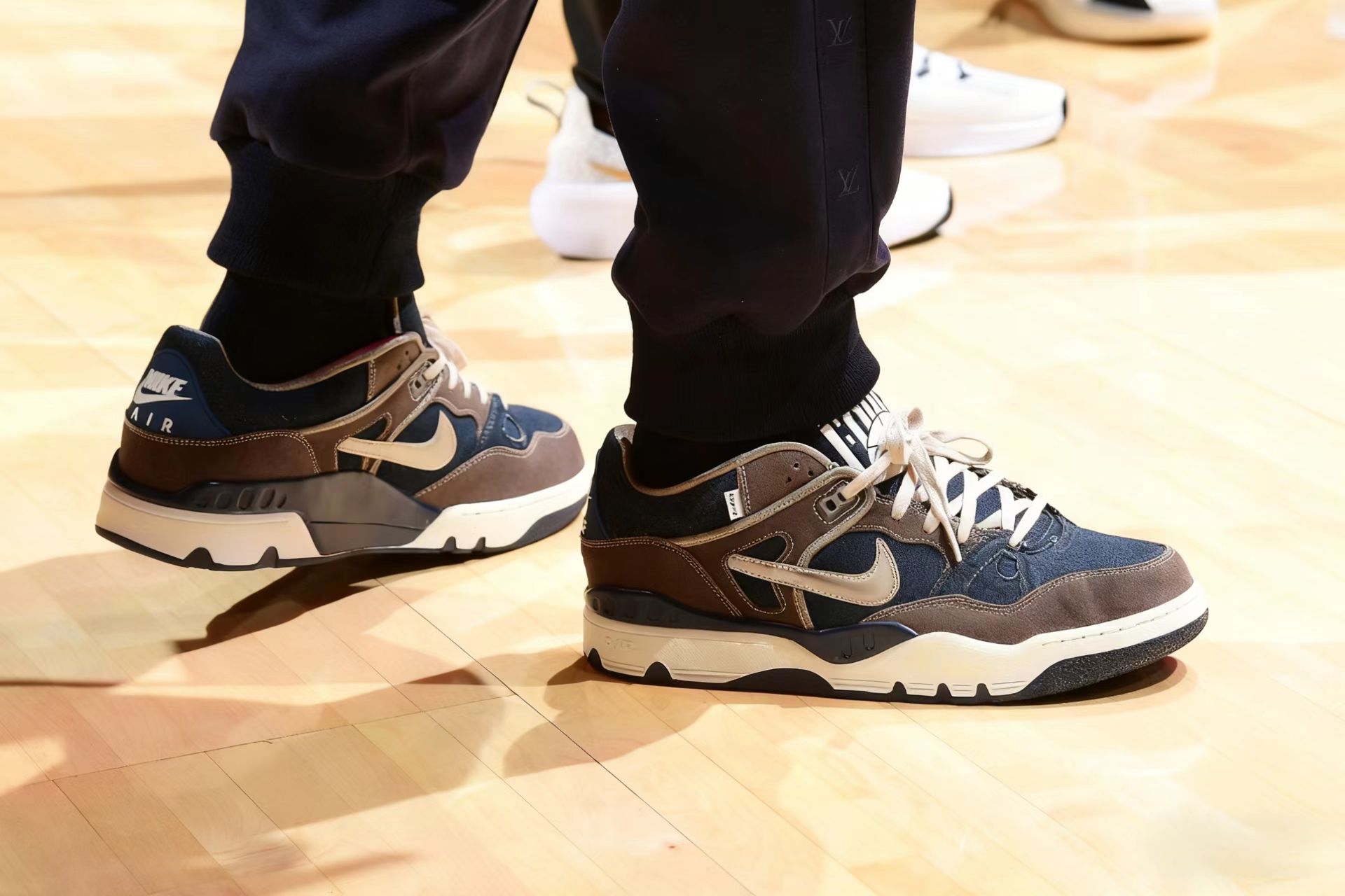 本場比賽,外套湖人隊球員勒布朗-詹姆斯穿著棋盤格牛仔外套以及李維斯×Nigo×Nike Air Force 3“Engima Stone”三方聯名款休閑板鞋現場觀戰。及李