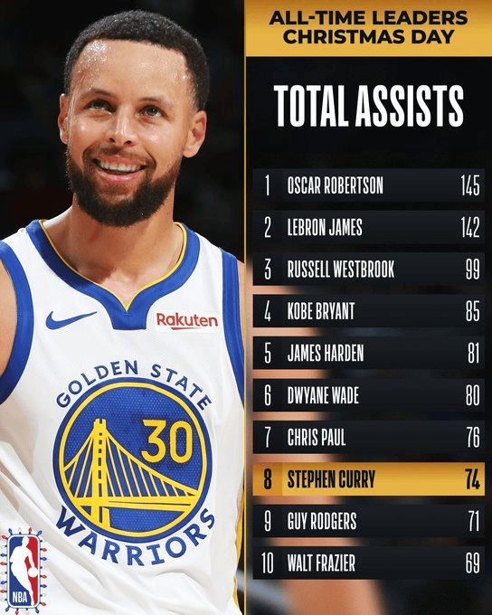 據NBA官方統計,庫里在NBA圣誕大戰中已74次助攻,升至歷史第八位。