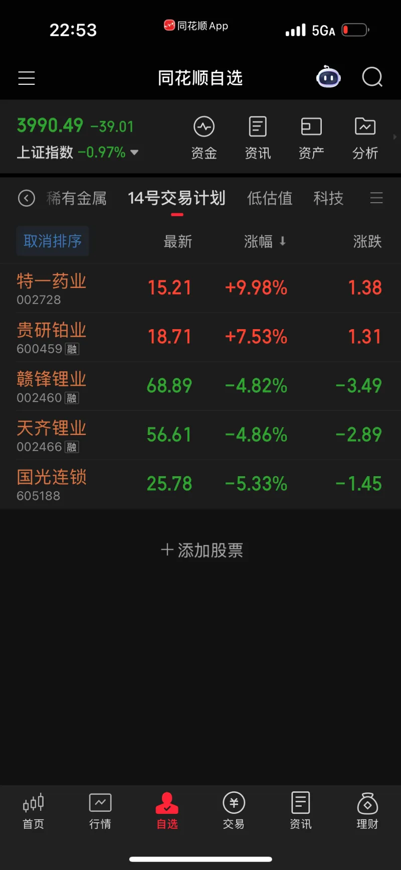 開戶快10天了。最近每天花5個小時以上復盤,學習A股各種,琢磨。本來昨晚列了今天的交易計劃的。還建立了14號交易計劃分組。打算重點關注昨天尾盤異動,流感行情的特一藥業,以及有色還沒漲過的,周線待發力的貴研鉑業。打算各半倉買入,還寫在了本子上,大家可以看本子上的計劃。結果早上發現合富低開,瞬間上頭了,被貪婪沖昏了頭腦,一股腦一分鐘之內梭哈上車了。所有昨天的計劃全部白費,那兩個計劃早上買入的股也漲停了,一來一去心態有點難受。果然,炒股,最先要戰勝的是人性。