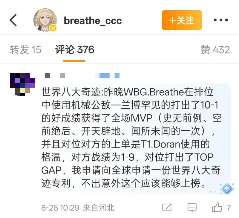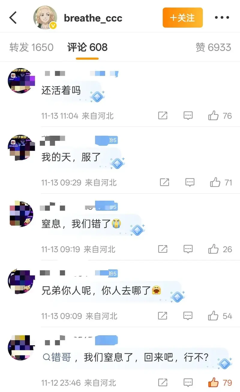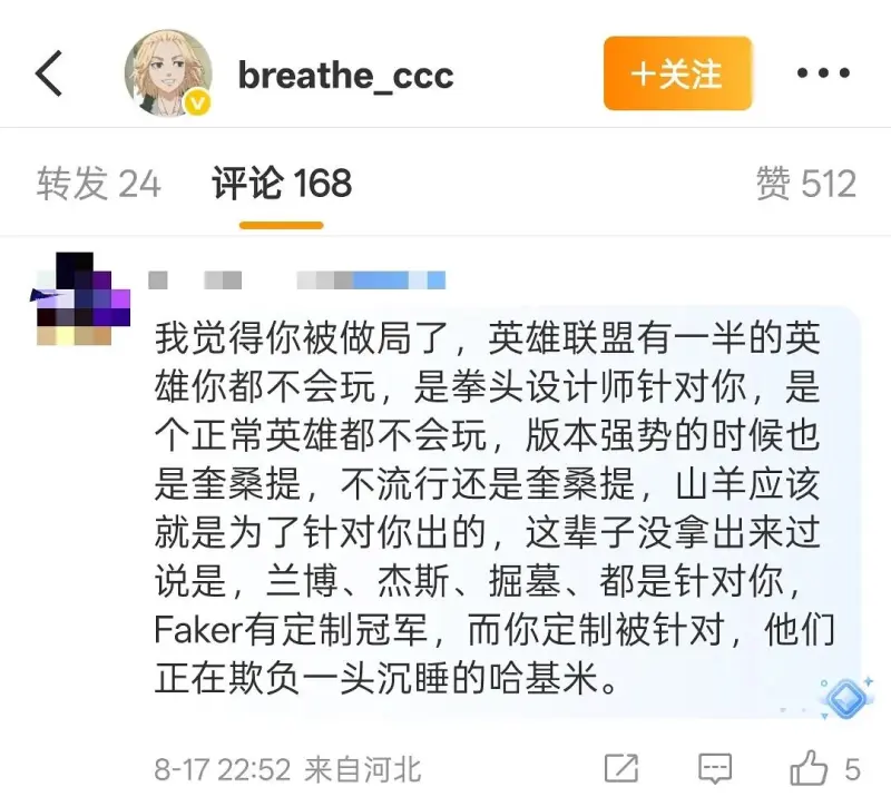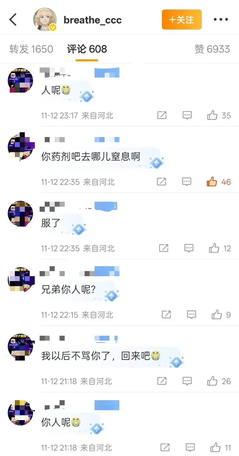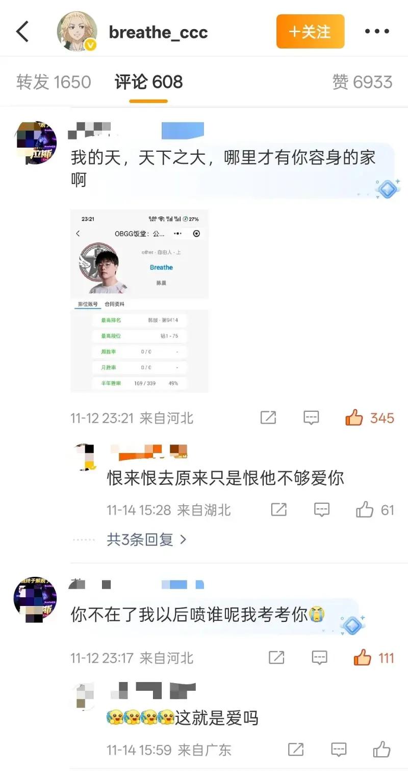 事情大概是這樣的,此人是呼吸粉絲,但因其比賽表現和成績,一直對呼吸是又愛又恨,最近轉會期有呼吸離開WBG的說法,然后坤哥(粉絲id叫cxk加一串數字)直接破大防,直呼“窒息,我們錯了”