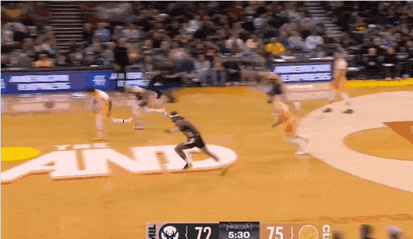比賽第三節,板點克雷格-波特搶斷反擊,燃主一馬當先起飛隔扣羅林斯。場克