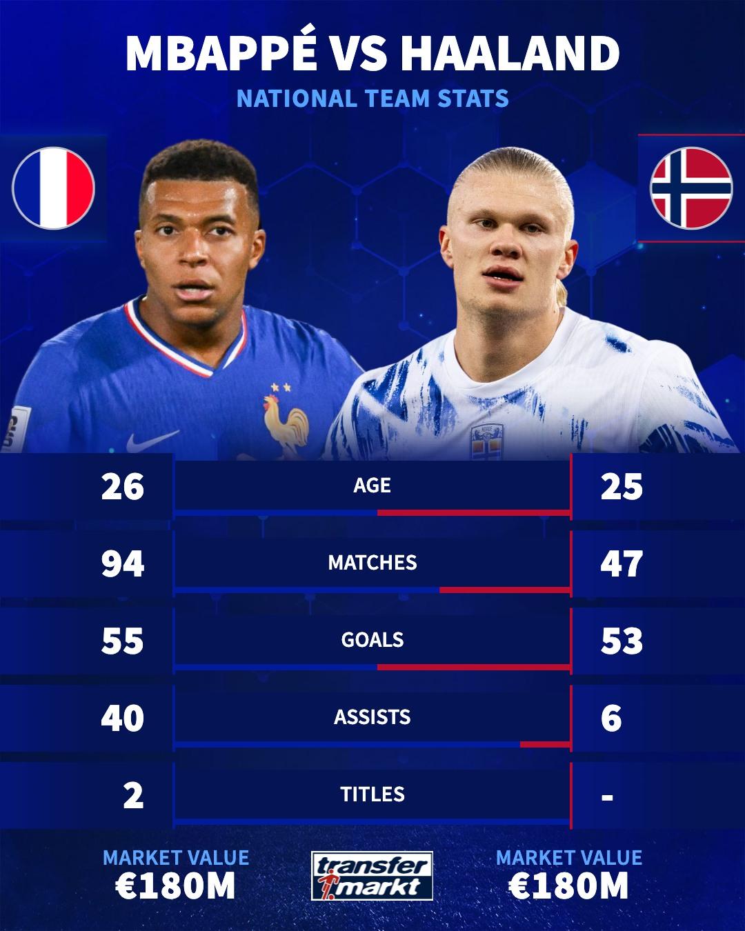 虎撲11月16日訊 德國轉會市場對比了姆巴佩和哈蘭德各自在國家隊的數據,詳情如下: