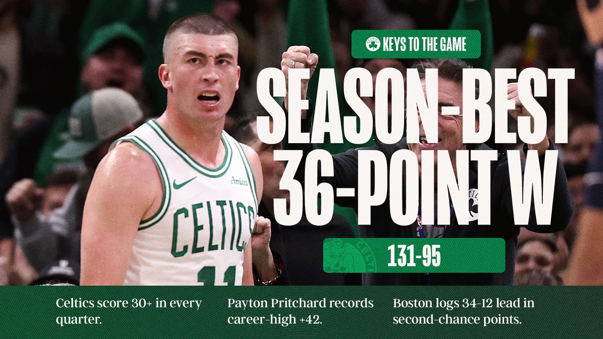 凱爾特人今日凈勝對手36分,刷新了賽季新高。