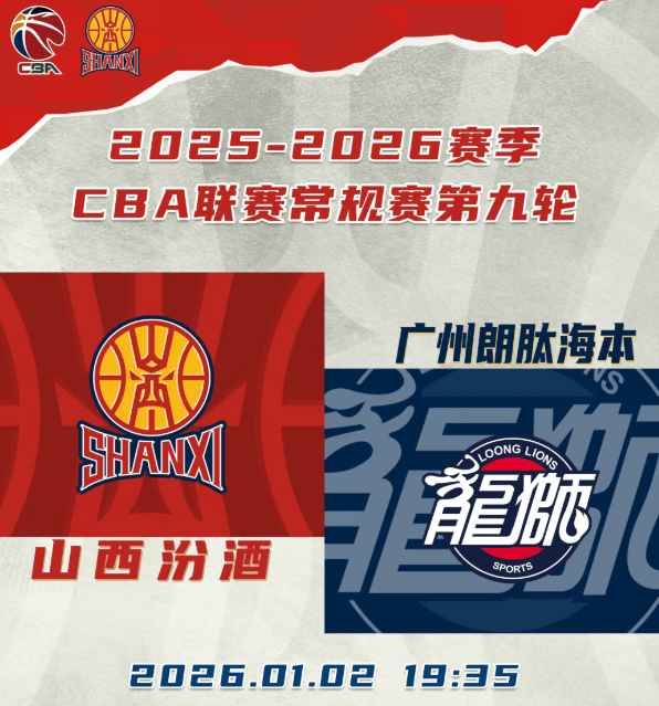 虎撲01月01日訊 據山西男籃官方發文,北京時間2026年1月2日19:35,2025-2026賽季CBA聯賽常規賽第九輪繼續進行,山西汾酒迎來新年首戰,主場對陣廣州朗肽海本。