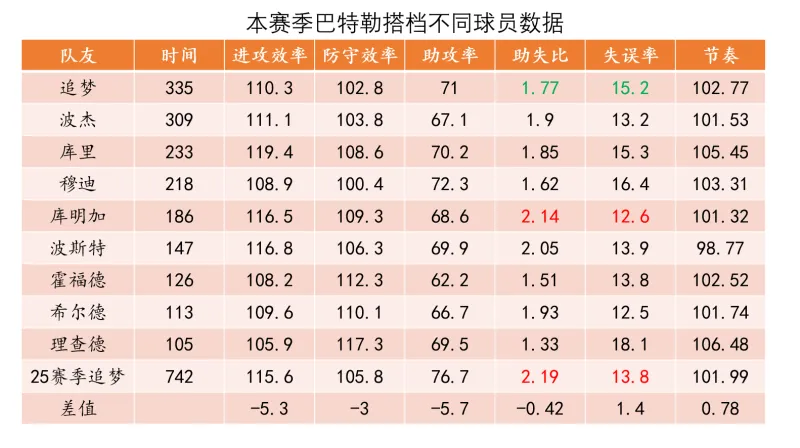 上面4張圖只是最終造成巴特勒失誤的冰山一角,事實上如上面這張表格所示,本賽季當巴特勒和追夢同時在場的時候球隊整體的失誤率和助失比表現都非常糟糕,15.2%的失誤率是巴特勒搭檔隊友里的第4高的、助失比則是倒數第4,而上賽季兩人剛開始時的搭檔是非常默契的,高達76.7%的助攻率和2.19的助失比、兩項數據放到本賽季都是能排名第一的存在。結果在通過訓練營的練習和磨合之后反而兩人的默契程度越來越差,著實令人唏噓。