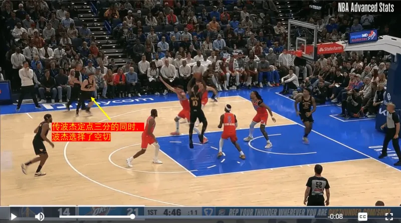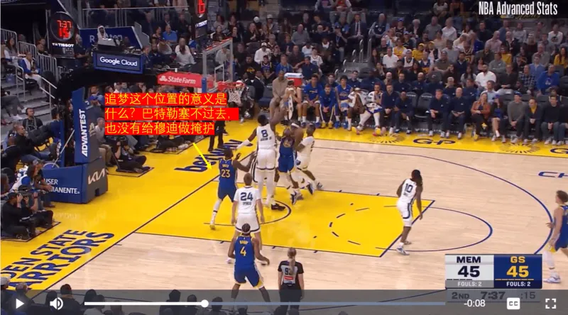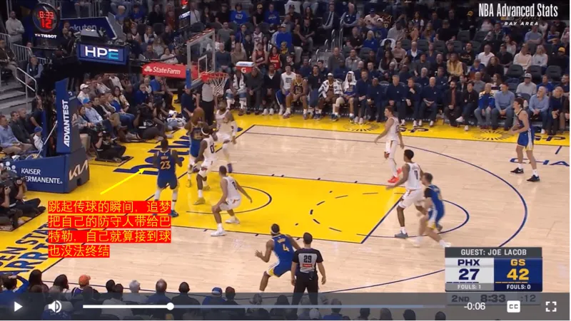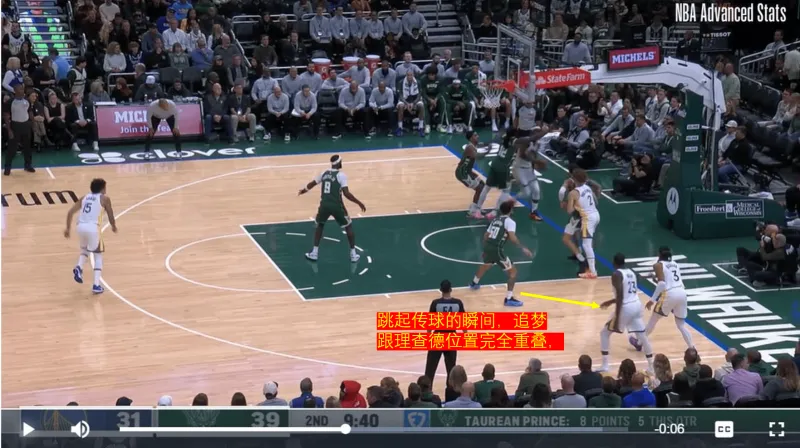 第3張圖在巴特勒跳起傳球的瞬間,追夢和理查德的位置完全重疊,這導致雄鹿隊的50號可以很輕松的直接防住勇士隊的兩名球員,從追夢此刻的肢體語言看他顯然也沒有做好接球的準備,似乎在進攻端“走神”了。