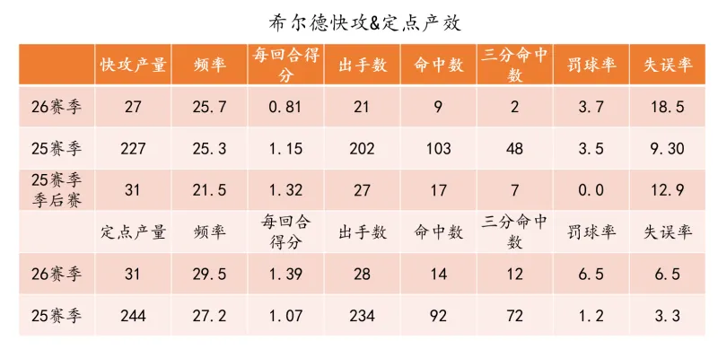 比如在上賽季季后賽中,希爾德的快攻進球里有接近一半都是來自于三分出手,常規賽也有40%的快攻比例來自于三分。所以如果要想激活希爾德,我認為需要更多的讓他回歸到射手角色之中,少去做空切,特別是巴特勒單獨帶隊時。