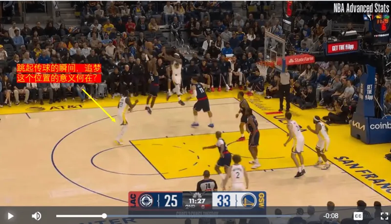 上圖是巴特勒吸引協防后跳起傳球失誤的瞬間,可以看到此時追夢的位置非常奇怪,因為這個位置在沒有與3J拉開足夠距離的背景之下,他是沒辦法接到巴特勒的可能傳球的。就算巴特勒傳過來他也沒有能力直接得分。而上賽季這種情況他通常是站在底角等待來球,或是順勢給穆迪做一個掩護、為穆迪創造一個無球掩護三分的機會,可這樣的站位相當于是把自己的防守人直接帶給了巴特勒卻不會遭到任何的懲罰,對于巴特勒而言無疑是上了一層枷鎖。