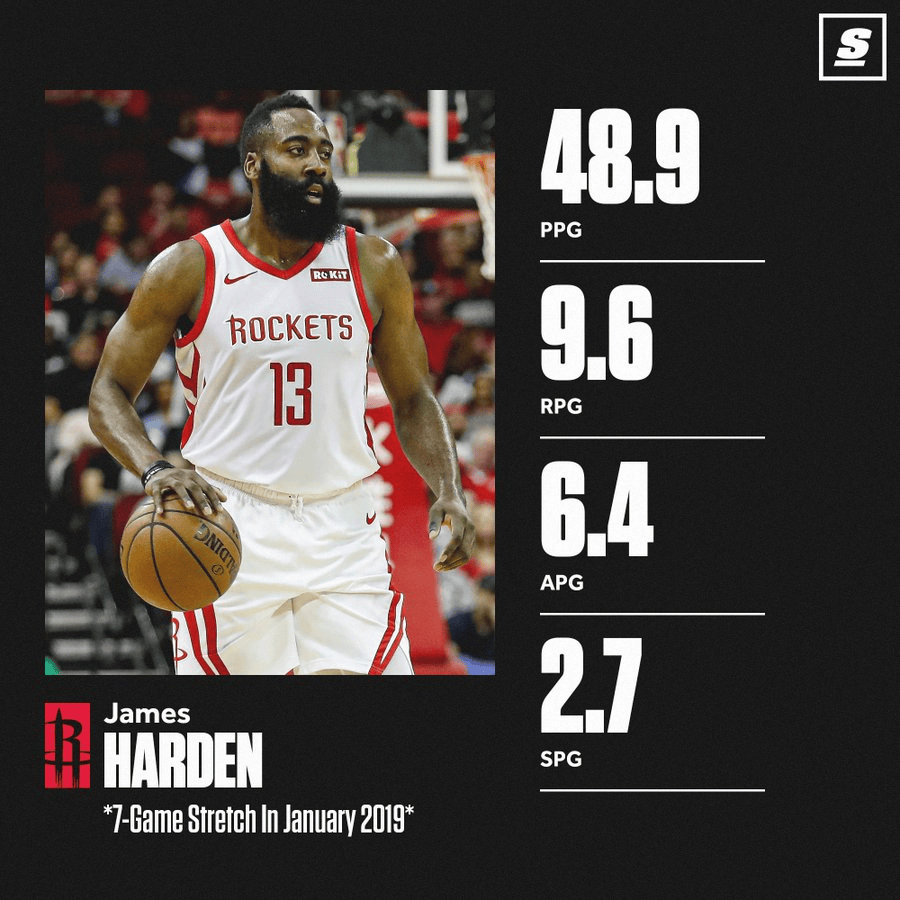 在2019年1月的媒體連續7場比賽中,哈登場均可以得到48.9分9.6籃板6.4助攻2.7搶斷。曬哈