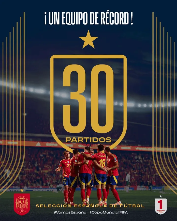 這些無可辯駁的數據凸顯了這支現役西班牙隊的實力,他們距離追平世界紀錄只差一步——這一紀錄由意大利隊保持,他們在2018至2021年間保持31場正式比賽不敗。