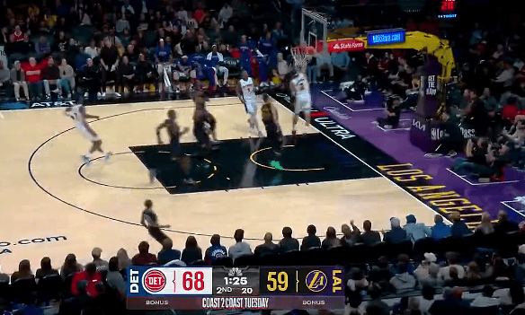 虎撲12月31日訊 NBA常規賽,湖人對陣活塞的坎寧扣砍比賽正在進行中。