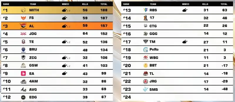 day4最后一把,MiTH絕殺FS,以1分優勢奪得單日冠軍,算是彌補了day1冠軍被AL絕殺的遺憾;而EDG最后一把在優勢情況下,松松垮垮打完,不敵ZCG,吃雞“首尾呼應”失敗,EDG自day1吃下首雞后,就顆粒無收。。最慘還是FS,展現出了最穩定發揮,卻總是離單日冠軍差一丟丟,這樣,FS獎金自然比不上奪過單日冠軍的隊伍~