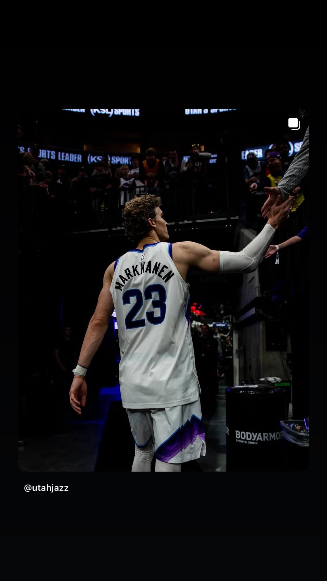 虎撲11月17日訊 爵士球員勞里-馬爾卡寧更新個人社媒,曬出賽后退場與球迷擊掌合影。板馬