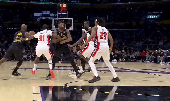 虎撲12月31日訊 NBA常規賽,湖人對陣活塞的身背比賽正在進行中。